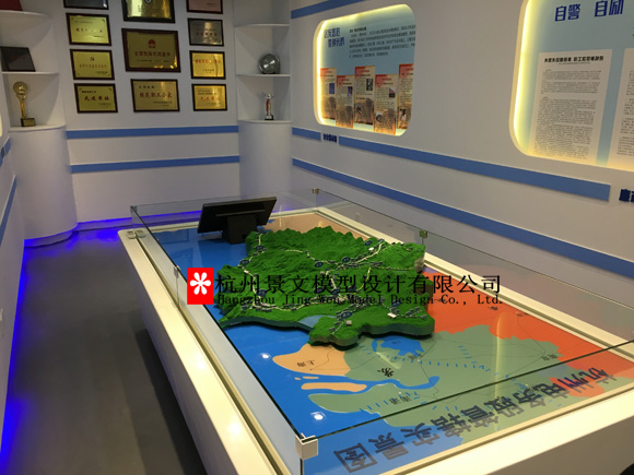 上海鐵路局杭州電務段展館沙盤一體化施工由杭州景文模型設計有限公司設計制作完成,沙盤模型配備多媒體互動,主要展示了:【基本概況】【形勢任務】【風采展示】【安全警示】【廉政教育】【轄區線路】等六大板塊。